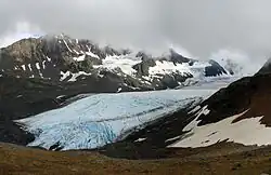 During the general retreat of the ice following the intense glaciation of the region, the Crow and Glacier creek glaciers separated. The Crow Creek glacier retreated the more rapidly because of its smaller area of ice supply, but the Glacier Creek glacier retreated sufficiently to allow the escape of the Crow Creek waters, which cut a gorge of considerable depth in the bedrock. A later advance of the Glacier Creek glacier, accompanied probably by a slight advance of the Crow Creek glacier, pounded the Crow Creek waters with a resultant deposition of their load and the filling of the gorge and of part of the valley with water-laid sediments. With the final retreat of the glaciers to their present position, Crow Creek cut a new channel through the fluvioglacial deposits, deviating somewhat from its former channel and exposing the latter where the channels cross.[3]