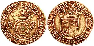 The first such coins were minted in 22 carat "crown gold", and the first silver crowns were produced in 1551 during the brief reign of King Edward VI. However, some crowns continued to be minted in gold until 1662.[1] No crowns were minted in the reign of Mary I, but silver as well as gold crowns again appeared in the reign of her successor Elizabeth I. Until the time of the Commonwealth of England it was usual for some crowns to be minted in gold as well as in silver, so both versions of the coin can be found for James I and Charles I.