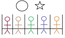 After being sat into their individual cubicles, participants would make judgment decisions about various stimuli that were projected onto the wall in front of them. For example, one slide showed various shapes (e.g., a star and a circle), and the participants were asked to judge which shape had the greater area. The major difference between the Crutchfield Situation and Asch Situation was in how participants gave their responses. Instead of stating their answers aloud, each participant stated their response by flipping an appropriate switch on an electric control panel installed inside each cubicle. Prior to beginning the study, the experimenter explained that all of the response panels were interconnected such that the response of each participant would be displayed on all other corresponding panels. In other words, the response by the participant in cubicle A would be displayed on the other panels in cubicles B, C, D, and E (and vice versa; e.g., B's response was displayed on A, C, D, and E, etc.). As explained by Crutchfield in his own words, each participant's response “information would appear on the other panels in the form of signal lights, among five rows of eleven lights, each row corresponding to one of the five panels."[2]