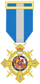 The War Cross (Spanish: Cruz de Guerra) is a high military award of Spain to recognise battlefield bravery. This decoration aims to prize those who have realized actions or facts of great efficiency, or they have given excellent services, both with valour during a continued period, inside one armed conflicts or of military operations involving or could involve resort to force, and carrying military abilities or remarkable command skills.