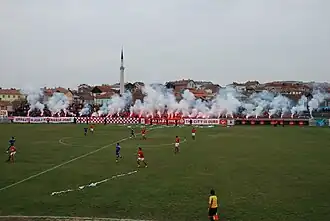 At Skifterat there are groups of hooligans who do incidents especially during the derby against Drita.[1] There have also been other incidents involving hooligans coming to blows with one another which ended up with some injured. There was an incident between the fans of Gjilan and Drenica and also the most dangerous incident was between Gjilan and Vëllaznimi in 2017–18 season, where 23 people injured.[2] There have also been incidents of burning of flags of countries like Serbia, North Macedonia, Greece, or Montenegro.