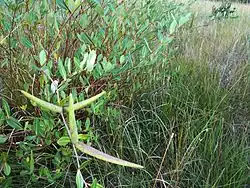 Cryptolepis oblongifolia, the red-stemmed milk rope, is a multi-stemmed shrub in the family Apocynaceae. It is native to moist and mesic regions of southern Africa, where it occurs in rocky grassland, grassy woodland or riverine vegetation.[3] It is found from South Africa[4] to Zambia.[3] It grows about 1m tall, and carries widely spaced, opposite leaves on the reddish-brown stems. The yellow to reddish-yellow flowers appear in axillary clusters.