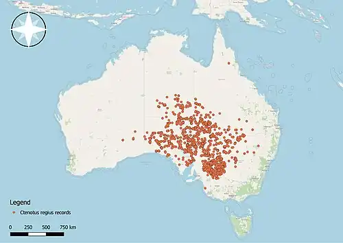 Ctentotus regius is endemic to Australia, with a distribution isolated to the in north-west of New South Wales, the south-west of Queensland, the south-east of Northern Territory, the north-east of South Australia and the north-west of Victoria.[2] Atlas of Living Australia currently holds 7,697 records for the species across Australia, although some of these may be misidentifications.[2] Records for the species exist in a number of National Parks and Nature Reserves within New South Wales, including Mallee Cliffs NP, Tarawi NR, Mungo NP, Sturt NP, Kinchega NP, Nocoleche NR and Yathong NR.[8]