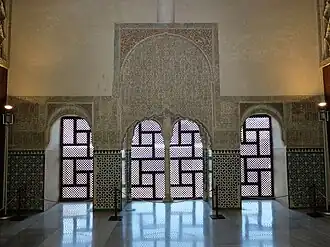 The main hall is flanked by three side chambers and alcoves on either side. This layout is very similar to the original layout of the Alcázar Genil, a nearby Nasrid country estate to the southwest.[1] The hall is richly decorated, with zellij tiles along the lower walls, the upper walls covered with carved stucco, and a large pyramidal and coffered wooden ceiling with geometric motifs. The back wall is pierced by three large windows, set into deep alcoves within the thick walls, starting at ground level. The windows would have offered an uninterrupted view over the Genil River. All these decorative features were subsequently standard in Andalusi and Maghrebi architecture across the region, demonstrating that many of the architectural traditions of the era were already established by this point. The design of the hall, including its integration into an existing defensive tower, is also reminiscent of the larger and later Hall of the Ambassadors in the Comares Palace of the Alhambra.[1][2][3]