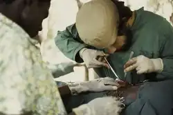 In 1960, Cuba sent an emergency brigade to Chile to assist the recovery from the Valdivia earthquake.[13] The program was officially initiated in 1963 as part of Cuba's foreign policy of supporting anti-colonial struggles. It began when Cuba sent a small medical brigade to Algeria, which suffered from the mass withdrawal of French medical personnel during the Algerian War of Independence Some wounded soldiers and war orphans were also transported back to Cuba for treatment.[14][15] Cuba was able to put this program in place despite half the country's 6,000 doctors fleeing after the Cuban revolution.[1] Between 1966 and 1974, Cuban doctors worked alongside Cuban artillery in Guinea-Bissau during its war of independence against Portugal.[1] Cuba's largest foreign campaign was in Angola where, in 1977, two years after the campaign's commencement, only one Angolan province out of sixteen was without Cuban health technicians.[16] After 1979, Cuba also developed a strong relationship with Nicaragua.[17]