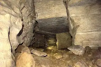 The team also included eight experienced British cavers who thoroughly explored the cave and conducted an accurate survey to produce a detailed map of it. This expedition was financed by the Governments of Ecuador and the United Kingdom.[1] There was no evidence of Von Däniken's more exotic claims, although some physical features of the cave did approximate his descriptions, and some items of zoological, botanical, and archaeological interest were found. The team found passageways cut neatly and polished deep inside the cave and also burial sites dating back to 1500 BCE[11] The lead researcher met with Moricz's indigenous source, who claimed that they had investigated the wrong cave and that the real cave was secret.[14] Deep inside the cave, there are square shaped rock cuttings and rock structures resembling elongated doors and that portion is called Moricz portal.[1]