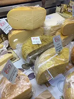 Penbryn Organic Farmhouse Cheese is made by Paul Knifton and Andrea Degen, who previously made Gouda cheese in Ireland and Holland respectively. The cheese moulds are filled with curd and wrapped individually by hand and stored for 8–10 months to enhance the flavour to give a traditional taste. Varieties include a Penbryn Mature cheese. Gilli Davies comments that they "produce some of the best cheese produced in Wales today".[75] Teifi Farmhouse Cheese is made at Ffostrasol, Llandysul and is considered to be one of the finest farmhouse cheeses made in Wales.[76]