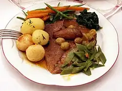 For much of its history Hamburg has been a major trading hub, resulting in both the development of a wealthy mercantile class, and a wide availability of goods from around the world. In the homes of wealthy residents, the kitchens were located in the back of the house, and divided into two parts. One part was the ‘splendor kitchen’, in which the tin and copper tableware was exhibited, and the other part was the real ‘work kitchen’, with a brick-built stove made of clay. The crockery and cutlery were kept in a cupboard called the ‘Schapp’ in the hallway, jars and bowls in the ‘Richtbank’, which was a table or low cupboard on which dishes and meals were prepared and arranged for serving. Since the 18th century there were also kitchens that were built into the cellars in the homes of tradesmen.[2] However many of the traditional dishes have their origins in the lower-class households of Hamburg's population. There were no separated kitchens in the domiciles and booths of the impecunious and poor and, as firewood was quite expensive, ovens were seldom used for cooking. This means that warm dishes were rare and if there was any cooking the dish was most commonly prepared as a stew.[3] A famous legend of the ‚Lachsessen‘ (lit.: salmon meal) hints to the nutritional differences between social classes.[4] According to it, Hamburg had such an abundant amount of salmon so even the poor did not want to eat it anymore. The council of Hamburg then enacted an edict saying that masters were not allowed to give salmon to their maidservants and minions more frequently than twice a week. Though this is only a legend it is indeed true that salmon were widely available since the 19th century.