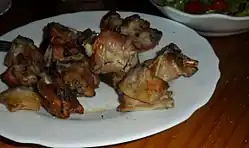 Dishes include lechazo asado (roast veal or lamb), cochinillo asado (roast suckling pig), cordero asado (roast lamb), morcilla (blood sausage or black pudding), asados al Sarmiento (roasted meat with wine), a typical dish in Santibáñez de Valcorba and environs, chuletones de buey (a large ox steak) with ajillo (garlic), typical in Peñafiel, and beef tojunto ("all together" stew) like "tojunto of Castile" (influenced by the gastronomy of Aragon). The embutido (sausage) called chitas is well known, prepared with the meat of suckling pig in adobo.