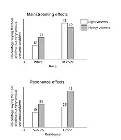 Mainstreaming, in the context of cultivation theory, refers to the process by which long-term exposure to consistent media messages can lead to the shaping of a shared social reality among heavy viewers.[7] TV viewers from disparate groups develop a common outlook of the world through exposure to the same images and labels, the effect being stronger among those whose TV viewing is more constant. Heavy viewers of television, for example, tend to perceive the world in ways that are more congruent with the portrayals and values depicted on television. As Gerbner and Gross noted, "Television's cultivation of shared conceptions and beliefs exerts a subtle but cumulative influence on the audience's judgments about reality". This theory underscores the idea that the media's repetitive messages can influence and shape the perceptions and attitudes of the audience, potentially leading to a more homogenized worldview among viewers who consume a steady diet of such content.[7]