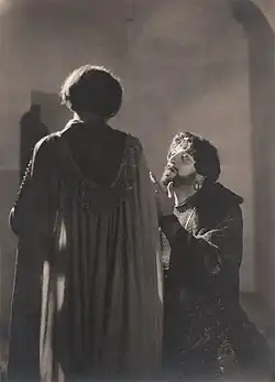 French novelist, playwright and actor Philippe Hériat played the part in Marco de Gastyne's Saint Joan the Maid in 1929.[87] The character plays an important role, personifying all the brutish soldiers that Joan of Arc (Simone Genevois) must unite under her banner. According to the review published at the time in Cinémagazine, Hériat's performance was "remarkable for its truth, intelligence and psychological subtlety. If his Gilles de Rais sums up all the vices of an era, he also has its faith."[88][89]