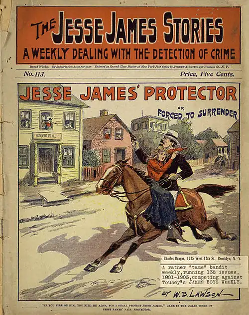 The James brothers became a staple in dime novels of the era, peaking in the 1880s following Jesse's death. James has often been used as a fictional character in many Western novels, including some published while he was alive. For instance, in Willa Cather's My Ántonia, the narrator reads a book entitled 'Life of Jesse James' – probably referring to a dime novel.