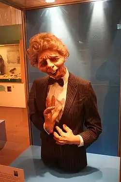 Roger Waters in 1983 referred to Thatcher sarcastically as "Maggie" multiple times throughout the Pink Floyd album The Final Cut. In the song "The Fletcher Memorial Home", Waters lists her as one of multiple "incurable tyrants and kings" interred at the titular asylum; in the closing line, he quietly speaks of applying the Final Solution to all of them.[26][27][28] A sound recording of Thatcher's voice also appears on Waters' 1987 solo album Radio K.A.O.S. toward the end of the track "Four Minutes", when a portion of her speech to the 1983 Scottish Conservative Party Conference can be heard: "...our own independent nuclear deterrent, which has helped to keep the peace for nearly 40 years."[29] The band Genesis in 1986 utilised a puppet representing her (as well as other politicians) in the music video "Land of Confusion" from the album Invisible Touch.[30]