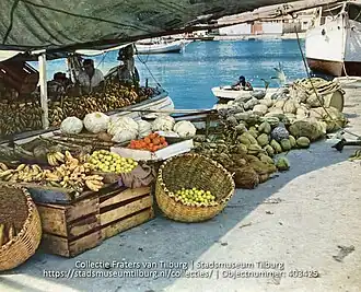 The three Dutch Leeward Islands, Curaçao, Aruba and Bonaire, located just off the coast of Venezuela, are among the driest islands in the Caribbean. An example of these economical exploitation in Aruba was deforestation during the Spanish and Dutch colonization, exacerbating significant soil erosion.[5] Due to their advantageous proximity to Venezuela, these islands received supplies of fruit and vegetables.[6] Presently, Aruba imports tropical fruits from United States of America, Colombia, Costa Rica, Dominican Republic, and the Netherlands.[7]