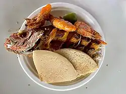 The indigenous people made flat cakes from cassava or corn, while the Africans introduced funchi or funge, similar to Italian polenta. Later, the corn flour mash adopted from the indigenous people was also called funchi. Various types of beans and okra (guiambo) were also brought to the Caribbean with the slaves.[9]
