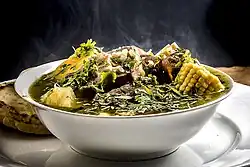 The sancocho is a typical example of a soup as a main course. In addition to fresh and salted meat, this dish contains vegetables, plantain, tubers, corn on the cob, and both sweet and regular potatoes.[15]