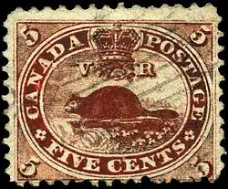 One of the national symbols of Canada, the beaver is depicted on the Canadian five-cent piece and was on the first Canadian postage stamp, c. 1859.