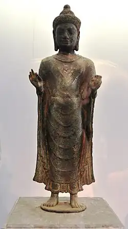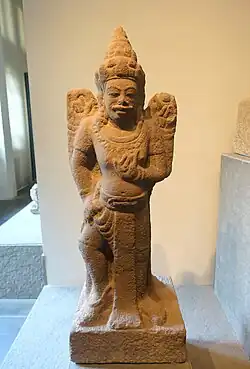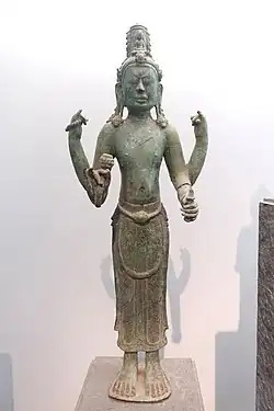 Vaishnavism entered Champa from Funan or Chenla, where characteristic depictions of crowned Vishnu date back to the 5th century. It likely arrived, like other Indian religions, through traders and sailors frequenting Cham ports. Most references to the Vaishnavite cult in Cham inscriptions date to the mid-7th century and are associated with King Vikrantavarman I.[87]