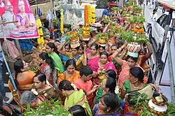 Hyderabadis, as residents of the city are known, may be either Urdu or Telugu speaking. [7] The traditional Hyderabadi garb is Sherwani Kurta Paijama, and Lungi for men,[8] Sarees, Khara Dupatta and Salwar kameez for women.[9][10] Burqa and Hijab is commonly practised among the Muslim women in public.[11] Most of the youth wear western clothing.[12] Public carnivals celebrated in Hyderabad include the,[13] Ganesh Chaturthi,[14] Bonalu, Eid ul-Fitr and Eid al-Adha, Milad Un Nabi
