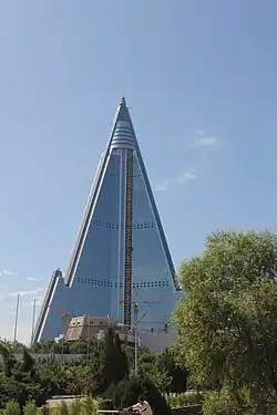 The third architectural category includes high-rise apartment complexes, including Harmonica houses, and hotels in the capital. The most striking of these buildings is the Ryugyong Hotel, unfinished as of now (with construction halted from 1992 to April 2008). Described as one of the world's tallest hotels at 105 stories, its triangular shape looms over north-central Pyongyang. The Koryo Hotel is an ultramodern, twin-towered structure forty-five stories high.[1]