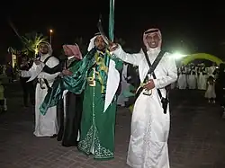 The religion and customs of Saudi Arabia dictate not only conservative dress for men and women, but a uniformity of dress unique to most of the Middle East.[50] Traditionally, the different regions of Saudi have had different dress, but since the re-establishment of Saudi rule these have been reserved for festive occasions, and "altered if not entirely displaced" by the dress of the homeland of their rulers (i.e. Najd).[51]