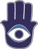 The hamsa (Tunisian Arabic: خمسة, also romanized khamsa), is a palm-shaped amulet popular in Tunisia and more generally in the Maghreb and commonly used in jewelry and wall hangings.[10][11] Depicting the open right hand, an image recognized and used as a sign of protection in many times throughout history, the hamsa is believed to provide defense against the evil eye. It has been theorized that its origins lie in Carthage (modern-day Tunisia) and may have been associated with the Goddess Tanit.[12]