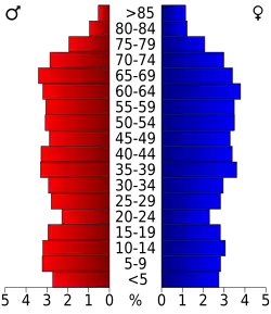 The population was distributed by age as follows, with 19.1% under the age of 18, 6.6% from 18 to 24, 20% from 25 to 44, 28.4% from 45 to 64, and 26% who were 65 years of age or older. The median age was 48.3 years. For every 100 females there were 95.5 males. For every 100 females age 18 and over, there were 92.9 males.