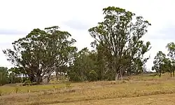 The grassy woodland is dominated by Grey Box (Eucalyptus moluccana) and Forest Red Gum (E. tereticornis), with Narrow-leaved Ironbark (Eucalyptus crebra), Spotted Gum (Corymbia maculata) and Thin-leaved Stringybark (Eucalyptus eugenioides) occurring sporadically. The ecoregion may have an open layer of small trees that would include such species of Acacia decurrens, Acacia parramattensis, Acacia implexa and Exocarpos cupressiformis.[26] The shrub layer is mainly contains Bursaria spinosa, indigofera australis, Hardenbergia violacea, Daviesia ulicifolia, Lespedeza cuneata, Dillwynia, Dodonaea viscosa, with plenty grasses such as Kangaroo Grass (Themeda australis) and Weeping Meadow Grass (Microlaena stipoides).[27]