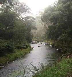 The Cumberland River rises south of Mount Cowley and south-east of the Benwerrin-Mount Sabine Road in the Otway Ranges in southwest Victoria and flows generally east before turning south just above popular short walk destination Jebbs Pool, between the high cliffs of Langdale Pike and Castle Rock, then along the cliff side of Cumberland River Holiday Park between The Brothers and Mount Defiance where the river reaches its mouth, crossing near the edge of a 200 metres (660 ft) sandy surf beach, and empties into Bass Strait, northeast of Wye River, Victoria and to the south of Lorne.[5] From its highest point, the river descends 532 metres (1,745 ft) over its 20-kilometre (12 mi) course.[6]