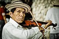 Music of the cumbia is easily recognized by its binary rhythm and short phrases which never descend and finalize, but seem to repeat continuously. As a musical form the cumbia is well-known today because the melodies and rhythm have been adapted to the modern and very popular pindín. In earlier times as violin, guitar, tambor, caja, triangle and maraca or churuca accompanied the cumbia. Today the accordion replaces the stringed instruments in most musical groups.[2]