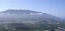 The Cumbre Vieja (Spanish pronunciation: [ˈkumbɾe ˈβjexa]; meaning "Old Summit") is an active volcanic ridge on the island of La Palma in the Canary Islands, Spain.[4] The spine of Cumbre Vieja trends in an approximate north–south direction, comprising the southern half of La Palma, with both summit ridge and flanks pockmarked by dozens of craters and cones.[5] The latest eruption began on 19 September 2021 in a forested area of Las Manchas locality known as Cabeza de Vaca. Voluminous lava flows quickly reached populated areas downslope, fanning out across settlements and banana plantations, destroying thousands of buildings and ultimately pouring over steep cliffs into the ocean to enlarge the island at several locations. The volcano went quiet on 13 December 2021, and on 25 December 2021, the local government declared the eruption to be over.[6]