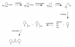 Ornithine is methylated to N-methylornithine and when decarboxylated, becomes N-methylputrescine. 4-methylaminobutanal is yielded from the oxidation of the primary amino-group. 4-methylaminobutanal then cyclizes to an N-methyl-l-pyrrolinium salt. The condensation of the pyrrolinium salt with acetoacetyl coenzyme A yields hygrine. Finally, the condensation of the hygrine molecule with another molecule of pyrrolidinium salt yields cuscohygrine.[1]