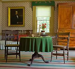 The first floor of the Custom house is organized around a center stair hall located opposite the front door. A custom room and private parlor flank the center hall in the front, while a kitchen with two pantries in a lean-to, a dining room, and a rear staircase are located in the back. Connected to the custom room is another lean-to structure with an exterior entrance that originally functioned as the post office, making the entire south side of the house reserved for Dering's work. The opposite side of the house features a north wing that was once a freestanding structure and was later attached to the main house. It was likely used for additional work-related purposes such as storage for food or goods related to Dering's professional responsibilities. Today, the north wing serves as an apartment. Five bed chambers are located on the second floor.[2]