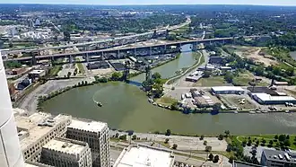 Cuyahoga Valley is a neighborhood on the Central and South Side of Cleveland, Ohio, located along the Cuyahoga River. Formerly known as Industrial Valley, the neighborhood was originally limited to only one section of the geographic Cuyahoga River Valley, but the city expanded it in 2012 to include the entire valley area.[3] The present neighborhood includes the Flats and extends from the peninsula of Whiskey Island on Lake Erie in the north to the borders of the suburbs of Newburgh Heights and Cuyahoga Heights in the south.[3] To the east, it borders Downtown Cleveland and the neighborhoods of Broadway–Slavic Village and Central. To the west, it borders the neighborhoods of Detroit–Shoreway, Ohio City, Tremont, and Brooklyn Centre.