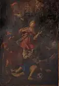 There are two paintings on the side walls of the vestibule by Daniel Seyter, the Martyrdom of St Catherine of Alexandria and the Martyrdom of St Lawrence. The first versions of these were painted by the Viennese artist between 1685 and 1686 using an unusual technique, oil on plaster. The paintings rapidly deteriorated and the best preserved fragments were sent to Massa by the cardinal to his nephew, Duke Carlo II Cybo-Malaspina in 1697. They were substituted with traditional oil paintings on canvas by the same Seiter between 1698 and 1700. The compositions remained similar.[5]