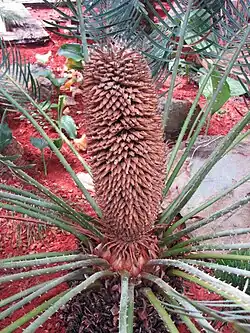 The female cones are open, with sporophylls 16–21 cm long, with two to four ovules per sporophyll. The lamina is narrowly triangular, with toothed margins and an apical spine. The sarcotesta is yellow-brown with a waxy coating, the sclerotesta ovoid and flattened. The male cones are solitary, ovoid, 16–20 cm long and 7–10 cm diameter, brown, and with an upturned apical spine.