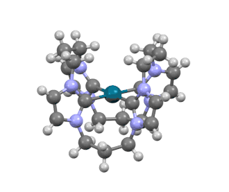 In 2007, Murphy, Sheng-ze Zhou and colleagues used this intuition to synthesize the first metal N-heterocyclic carbenes from a macrocyclic tetraimidozolium precursor via a similar deprotonation. As a result of the 24-atom-ringed tetra imidazolium ligand, both monomeric structures with Pd and Co and dimeric structures with Cu and Ag were obtained, as seen in the crystal structures below.[15][16][17]