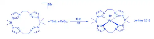 - ^ Anneser, Markus R.; Elpitiya, Gaya R.; Powers, Xian B.; Jenkins, David M. (2019-02-25). "Toward a Porphyrin-Style NHC: A 16-Atom Ringed Dianionic Tetra-NHC Macrocycle and Its Fe(II) and Fe(III) Complexes". Organometallics. 38 (4): 981–987. doi:10.1021/acs.organomet.8b00923. ISSN 0276-7333.