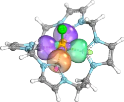 The strong σ-donation of the four NHC ligands make high-spin configurations less favorable as well as pushing the dx2-y2 orbital above the dz2. Additionally, many cyclic tetracarbene examples in the literature with an iron(II) center have a +2 change, whereas heme-iron(II) complex is neutral due to the -2 change of the ligand itself. Macrocyclic imidazolylborane derived NHC tetracarbene visualized above is an exception to this and is thought to resemble heme more closely.[1][4]