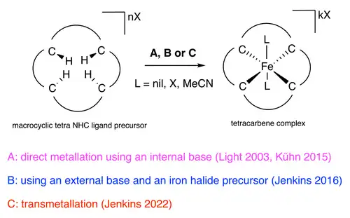 - ^ a b c d e f g h i j Schlachta, Tim P.; Kühn, Fritz E. (2023-03-20). "Cyclic iron tetra N-heterocyclic carbenes: synthesis, properties, reactivity, and catalysis". Chemical Society Reviews. 52 (6): 2238–2277. doi:10.1039/D2CS01064J. ISSN 1460-4744. PMID 36852959.