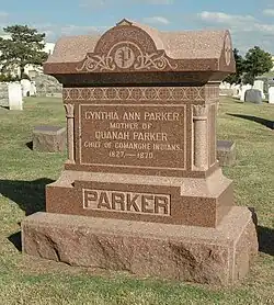 In 1910, Parker's son, Quanah, moved her remains and had them reinterred in Post Oak Mission Cemetery near Cache, Oklahoma.[22][23] When he died in February 1911, he was buried next to her.