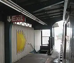 On the north end of each platform, a single staircase leads to a landing outside of a now closed station house. On the Queens-bound platform, a single exit-only turnstile provides exit from the system and a street stair perpendicular to the line leads to Autumn Avenue, which ends at Jamaica Avenue.[10] The exit on the Manhattan-bound platform was closed, and the street stair was removed.