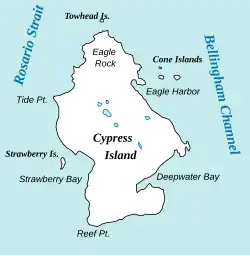 The first sighting of Cypress Island by Europeans was by the Spanish during the 1791 voyage of José María Narváez, who named it San Vincente.[5] The island was named again by Captain George Vancouver in early June 1792, when he mistook juniper trees for cypress trees. Vancouver reports that the Chatham, one of the vessels in his party, lost an anchor in Strawberry Bay, on the west side of the island.[6] Vancouver wrote: