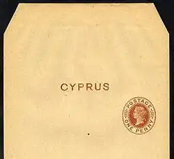 The first newspaper wrappers were Great Britain wrapper overprinted CYPRUS and issued in 1880. This wrapper is commonly found mint; only one complete used copy is known.[3] In 1881 the island was supplied with newspaper wrappers with the word Cyprus in the design. Different designs continued to be produced until 1976, after which they were discontinued.[2]