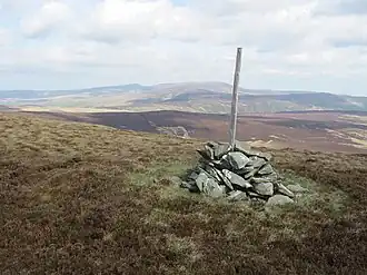 The views from the summit are extensive, if unremarkable due to the featureless, flat moorland surroundings. The summit is marked by a small cairn surrounded by peat bog.