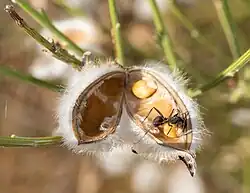 This is a tall shrub often exceeding 2 metres (6.6 ft) in height. It is highly branched and sprawling. The sparse leaves are made up of small leaflets about a centimeter long each. The shrub bears yellow legume flowers and the pods are covered in white hairs.