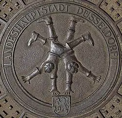 Cartwheelers are found in several fountains in the city. The best known is Radschlägerbrunnen (Cartwheeler Fountain) in the Burgplatz, created in 1954 by Alfred Zschorsch, with Hans Müller-Schlösser's inscription "Radschläger wolle mer blieve, wie jeck et de Minschen och drieve" ("We want to keep being cartwheelers, no matter how crazy the world might be").[1]