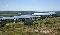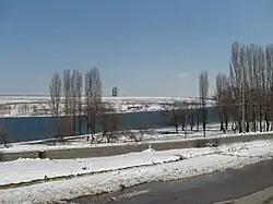 Dănceni is located on the bank of the accumulation reservoir, Lake Dănceni, which is located in the Ișnovăț river valley. The lake has a capacity of 4 million m3 and a surface area of 2.2 km2.[4] Its maximum depth is about 11 meters. In more recent years, the lake has regressed somewhat, especially during droughts or drier seasons, with the most northern part of it being affected the most and being taken over by many reeds, and tall grasses.[28][29] These reeds were subject to arson in May 2024, as pelicans which usually stop to feed at the lake on their yearly migrations were proving difficult to the fishermen.[30][31] An unauthorized and informal landfill site on the western edge of Dănceni grew in size in the 2000s, and there are concerns the plastic pollution is causing toxic chemicals to leach into the ground and water sources that feed into the lake.[32] In 2009, there was a large worry that a NATO scheme from 2002 to dispose of rocket fuel from a military unit near the town had contaminated the ground and created an ecological disaster, through the pouring of 50 tonnes of mélange in a cleared area of forest.[33]