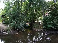Dědina has many tributaries, but none of them is significant. In addition to natural tributaries, the river also receives water from the Alba canal, which connects the Dědina with the Bělá River.[4] The canal was gradually built from the end of the 14th century until 1550. It used to feed a system of fishponds, which no longer exist today. It is a historically important example of landscape modifications in the Middle Ages, which is protected as a cultural monument.[5]