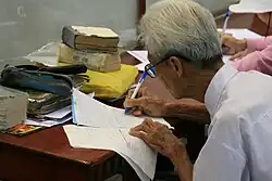 Although eligible to retire and collect a pension in 1990, Ngộ instead requested assignment to the public letter-writing service (also known as letters for hire), which had only six people at the time.[11][2] Eventually, all of the other writers died, leaving only Ngộ.[11][7][12] He convinced the post office to give him a desk at the end of the hall where he could offer his services.[7][13] Each weekday, Ngộ worked from 8 in the morning to 3:30 in the afternoon writing letters and providing tourist information.[14][15] He was commonly seen with a black bag, which contained various materials including dictionaries for his work.[7][16][17]